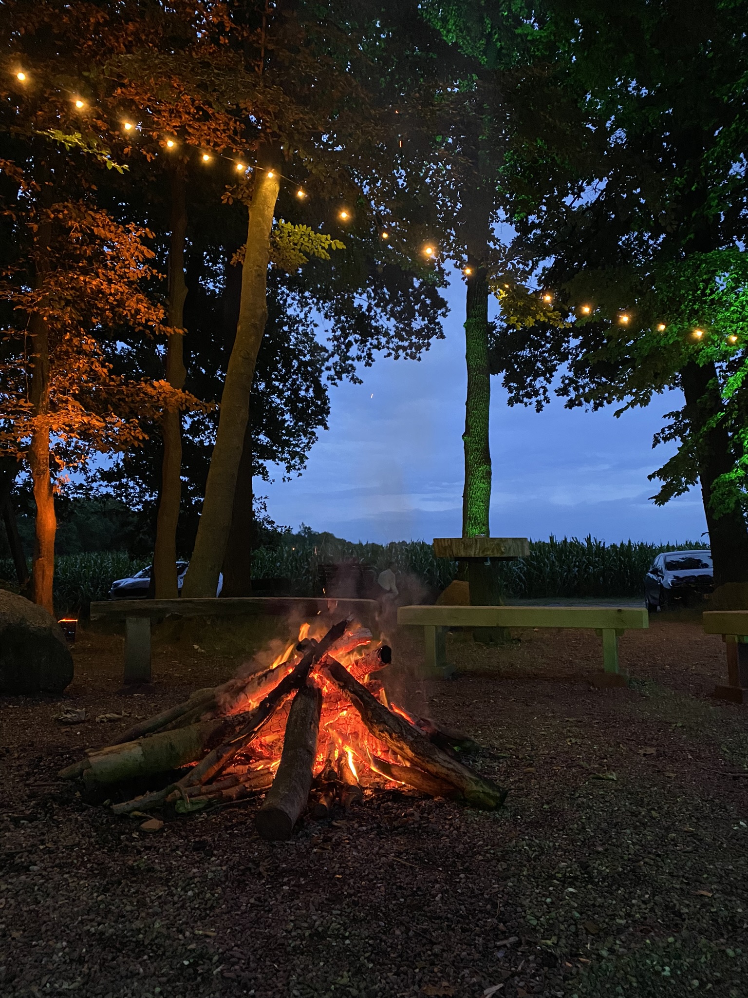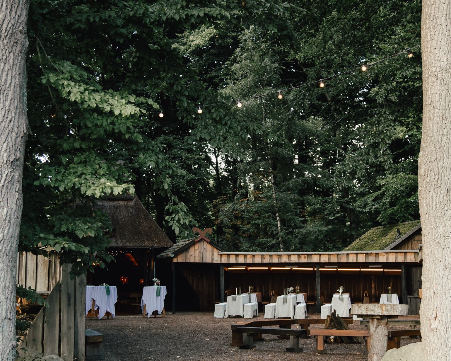 Der weitläufige Außenbereich bietet flexible zusätzliche Plätze unter den Baumkronen. Ideal für den Empfang oder lange Sommerabende am Lagerfeuer. Das Gelände nutzt ihr exklusiv – rundherum nur Wiesen und Wald.