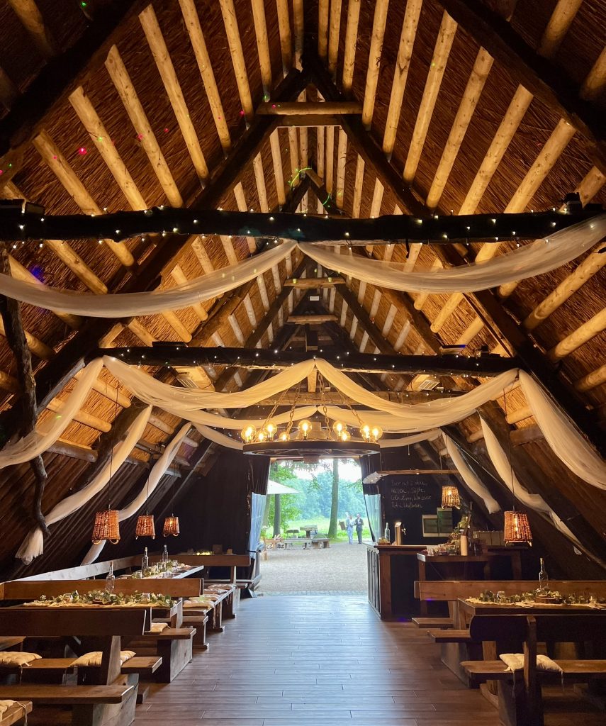 Der historische Reetdachschafstall ist das Herz eurer Feier. Alte Balken, warmes Holz und viel Atmosphäre schaffen einen besonderen Rahmen für euren Tag. Im Innenraum finden bis zu 80 Gäste sitzend Platz – ideal für gemeinsame Dinner und lange Feiern ohne Sperrstunde. Bei Regen kann auch im Schafstall die Trauung durchgeführt werden.